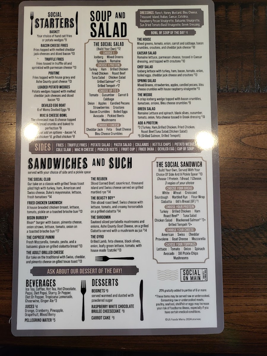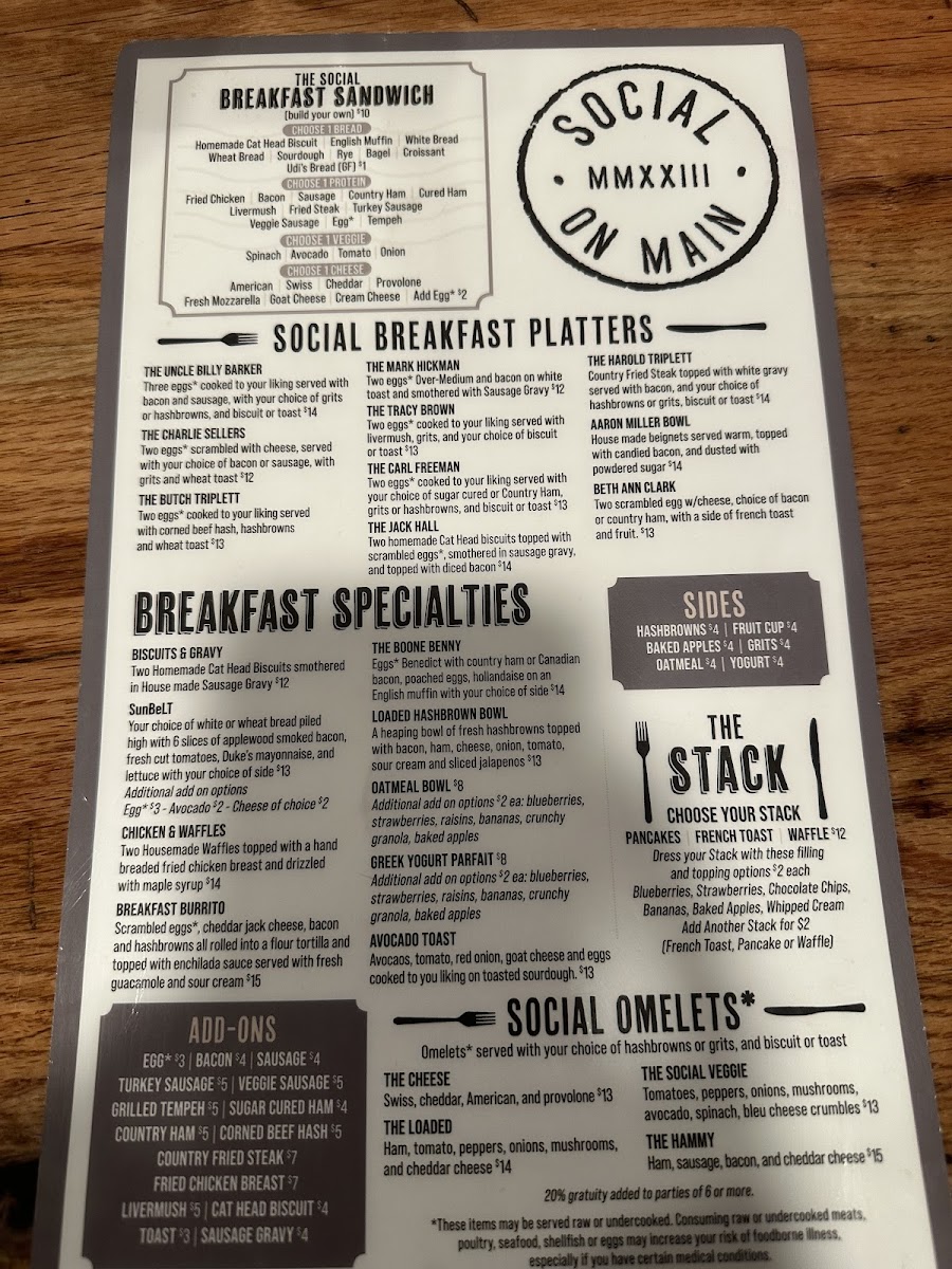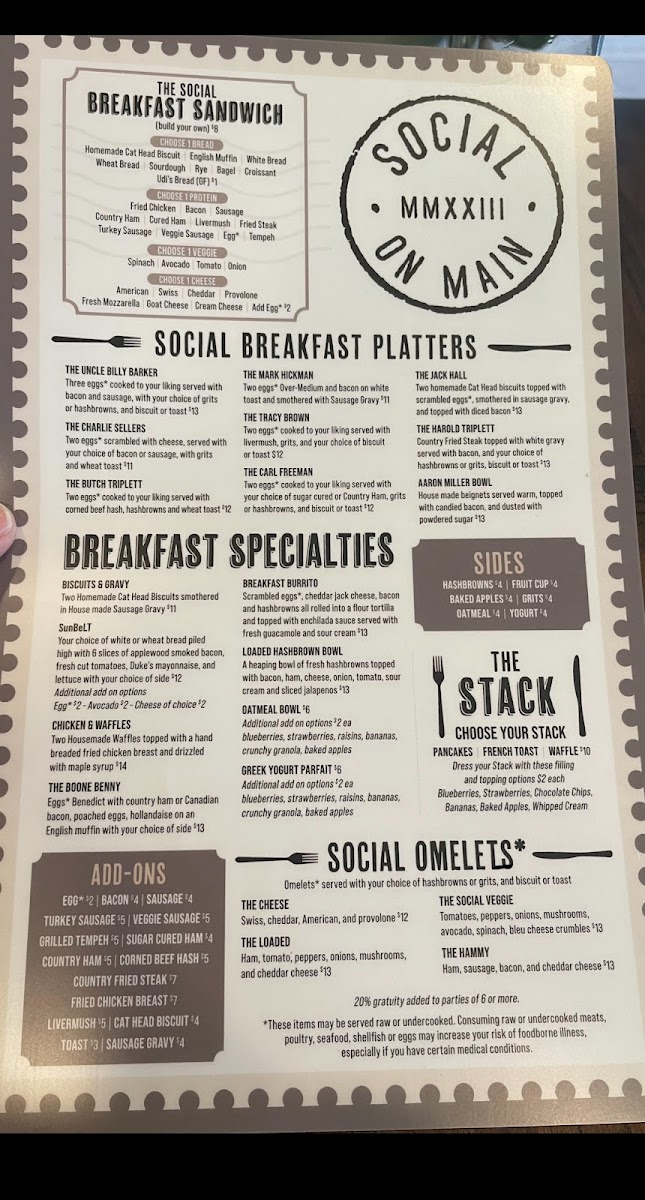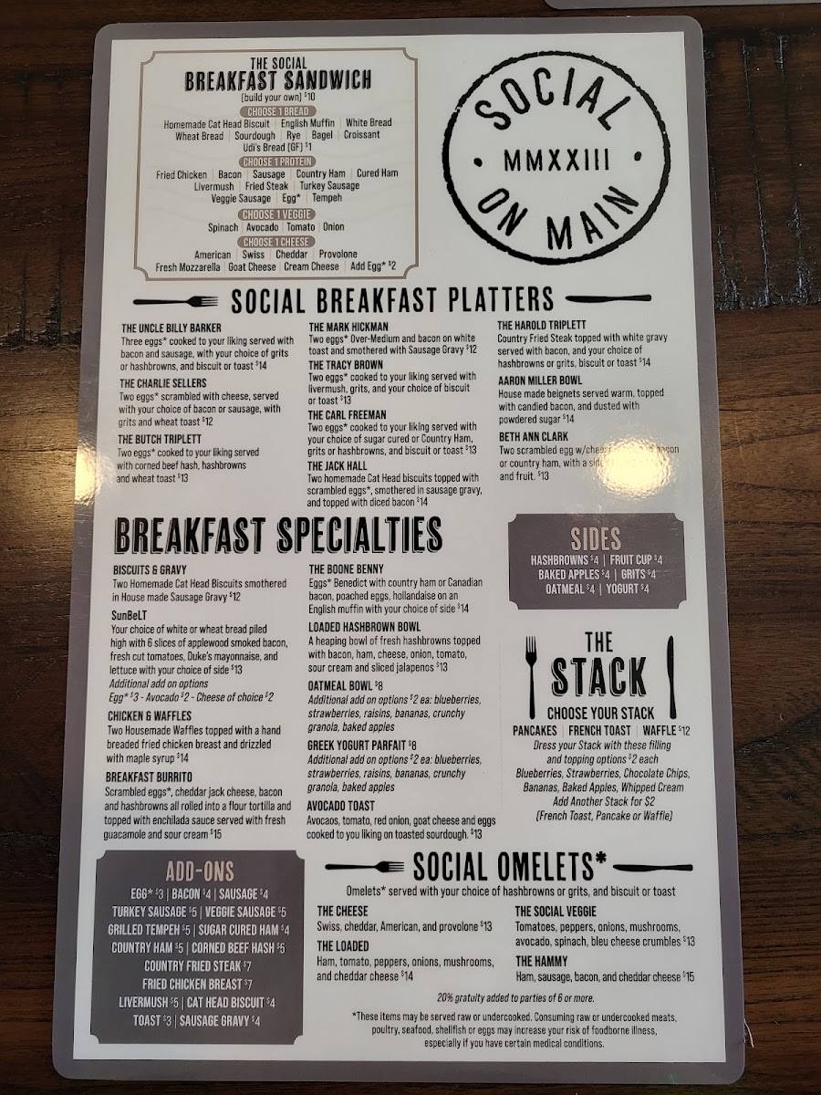 The menu at Social on Main offers a straightforward, comforting selection designed to suit mornings and midday meals in a relaxed, neighborhood-style setting. You’ll find classic breakfast and brunch favorites alongside casual lunch options, making it a welcoming spot whether you’re starting the day or taking a midday pause.