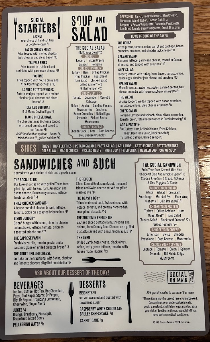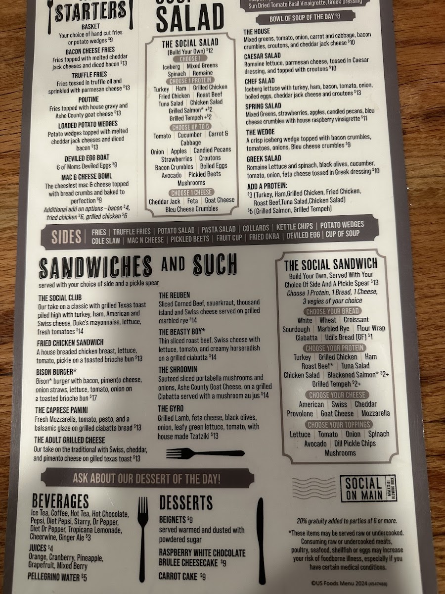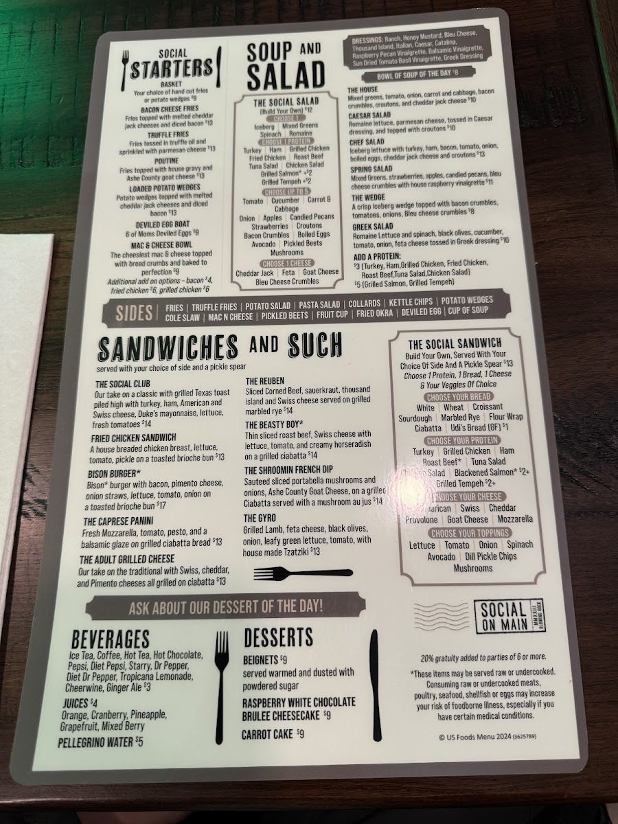 The menu at Social on Main offers a straightforward, comforting selection designed to suit mornings and midday meals in a relaxed, neighborhood-style setting. You’ll find classic breakfast and brunch favorites alongside casual lunch options, making it a welcoming spot whether you’re starting the day or taking a midday pause.